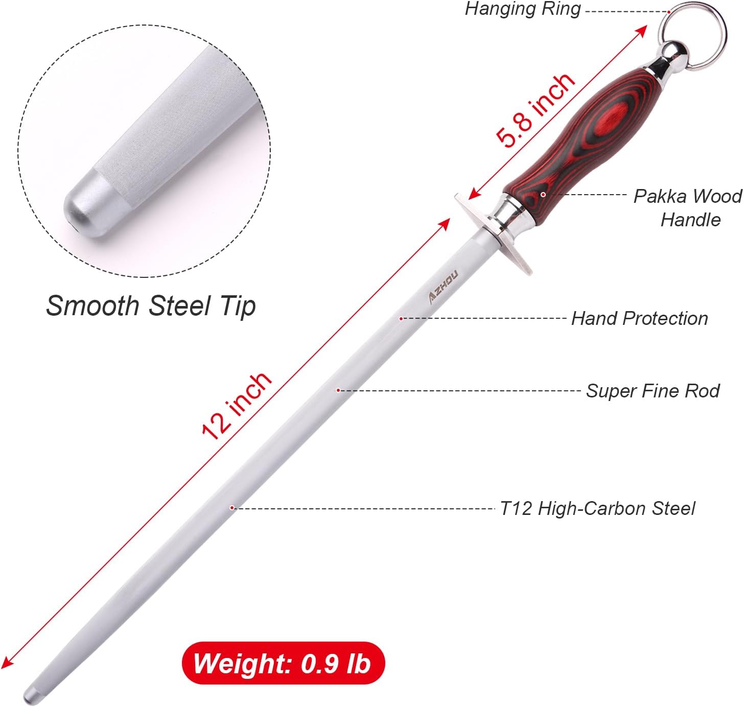Azhou 12" Professional Knife Sharpener Steel Rod - T12 Carbon Steel (HRC 65±1), Fine 200 Grit for Kitchen & Chef Knives, Easy to Use with Non-Slip Wooden Handle & Gift Box